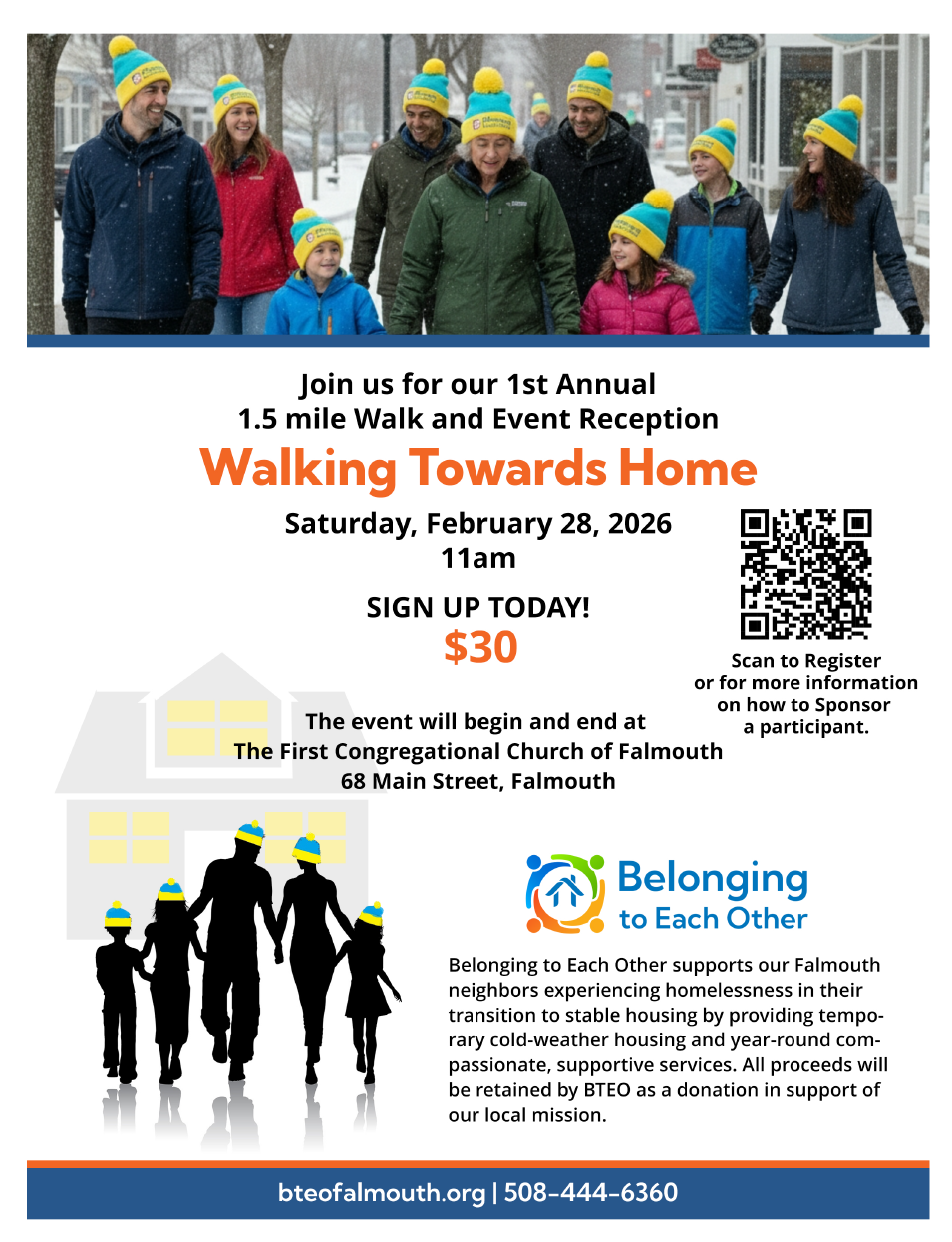 Belonging to Each Other (BTEO), the Falmouth, Massachusetts nonprofit providing winter shelter and year-round support services for Falmouth men and women experiencing homelessness, will host a fundraising walk and event reception on Saturday, February 28, 2026. As quoted in the Enterprise Falmouth in an article “Belonging to Each Other Trades Polar Plunge for Winter Walk” by Lin Lin Hutchinson, BTEO board chairman Annie Polachi observed, “We are not going to cancel it unless it is terribly bad weather. If it’s cold and rainy we are going to walk in the cold and rainy weather because that’s what happens with the homeless.”