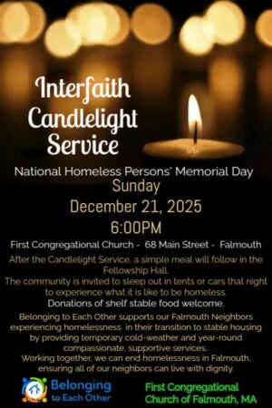 The longest night of the year, December 21st, is designated as National Homeless Persons’ Memorial Day. Belonging to Each Other (BTEO), the Falmouth-based nonprofit providing winter shelter and year-round support services for Falmouth men and women experiencing homelessness, is helping organize the vigil that honors those without homes who have passed away. The vigil is meant to call attention to this day of remembrance and to our neighbor’s plight. An in-person service will be held at 6 PM at the First Congregational Church of Falmouth on Main Street.
