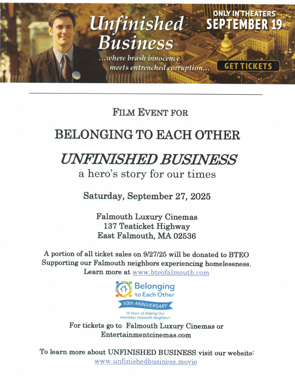 On Saturday, September 27, 2025, go to the Falmouth Luxury Cinemas at 137 Teaticket Highway in East Falmlouth, MA, and watch "Unfinished Business." Why? UNFINISHED BUSINESS is a gripping, character-driven [...]